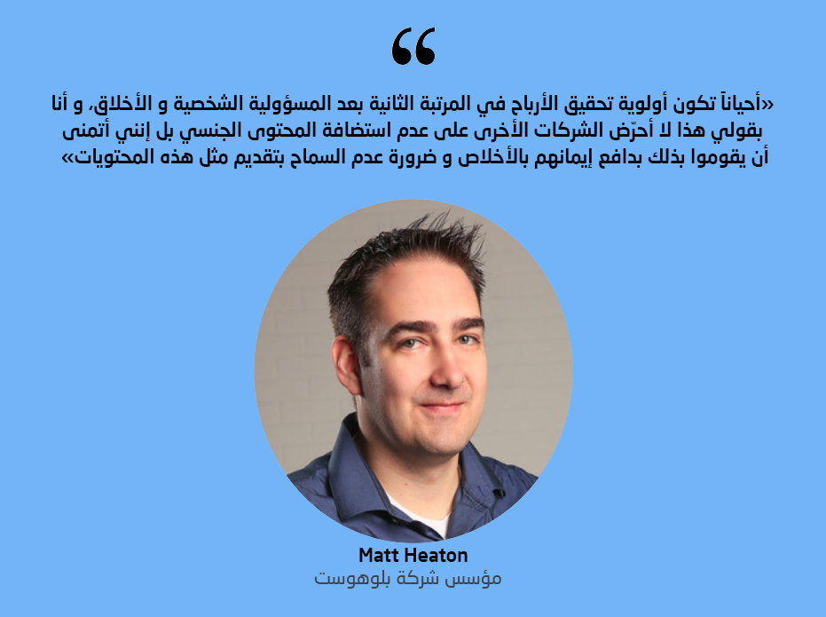 لا تقوم استضافة بلوهوست BlueHost بـ استضافة المواقع التي تحتوي على مواد إباحية، ويقول مؤسس الشركة مات هيتون أن شركة بلوهوست BlueHost لن تستضيف على سيرفراتها أي محتوى إباحي