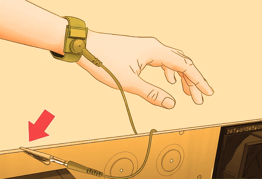 استخدم كبل رباط معصم مضاد للكهرباء الاستاتيكية لمنع التفريغ الكهروستاتيكي ElectroStatic Discharge (ESD) الذي يعمل على تفريغ إلكترونات الكمبيوتر. أو بدلاً من ذلك ، المس جسماً معدنياً كبيراً مثل المبرد لتفريغ الشحنات التي تحملها أنت.