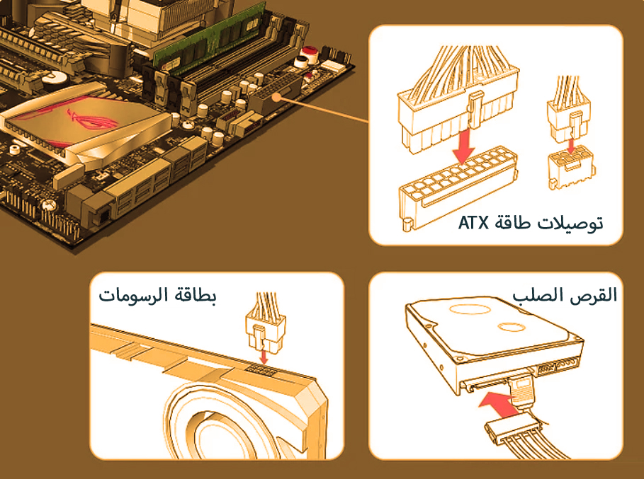 – قم بتوصيل مزوّد الطاقة بموصلات الطاقة الخاصة باللوحة الأم.