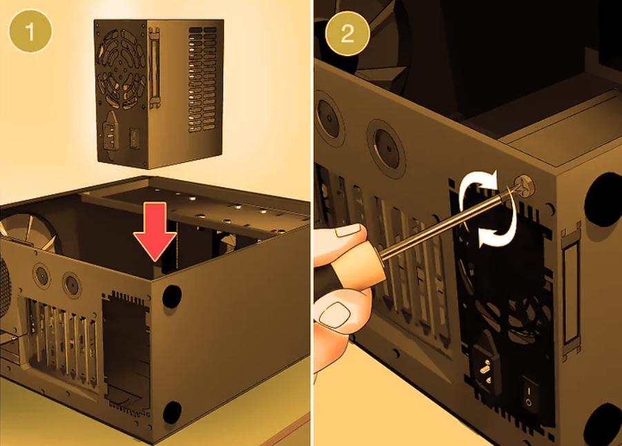 تأتي بعض صناديق المكونات Cases مع مصدر الطاقة مُثبّت مسبقاً ، بينما تتطلب بعض صناديق المكونات الأخرى شراء مورد الطاقة بشكل منفصل و تثبيته. تأكد من تثبيت مصدر الطاقة في الاتجاه الصحيح ، و أن لا شيء يمنع حركة مروحة مزود الطاقة. للمزيد انظر هذه المقالة (باللغة الانكليزية)