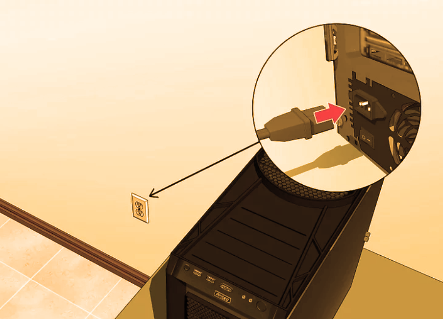 – قد تضطر أولاً إلى توصيل الكبل الكهربائي بإدخال مصدر الطاقة على الجزء الخلفي من صندوق مكونات الكمبيوتر.