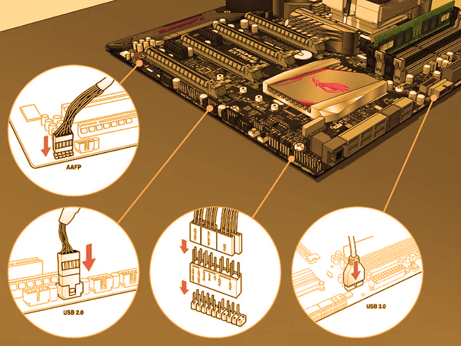 سيعتمد الترتيب الذي ترتبط به هذه الأكبال على أيها أسهل. تأكد من توصيل منافذ USB و مفاتيح الطاقة و إعادة الضبط و مصابيح LED و محركات الأقراص الثابتة و كابل الصوت. ستوضح لك وثائق اللوحة الأم مكان توصيل هذه الموصلات على اللوحة الأم. للمزيد انظر هذه المقالة (باللغة الانكليزية)