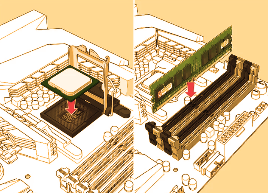 – قم بتوصيل ذاكرة الوصول العشوائي الخاصة بك باللوحة الأم من خلال إيجاد فتحات ذاكرة الوصول العشوائي و إدخال ذاكرة الوصول العشوائي بشكل مناسب (يجب أن تتناسب مع اتجاه واحد فقط).